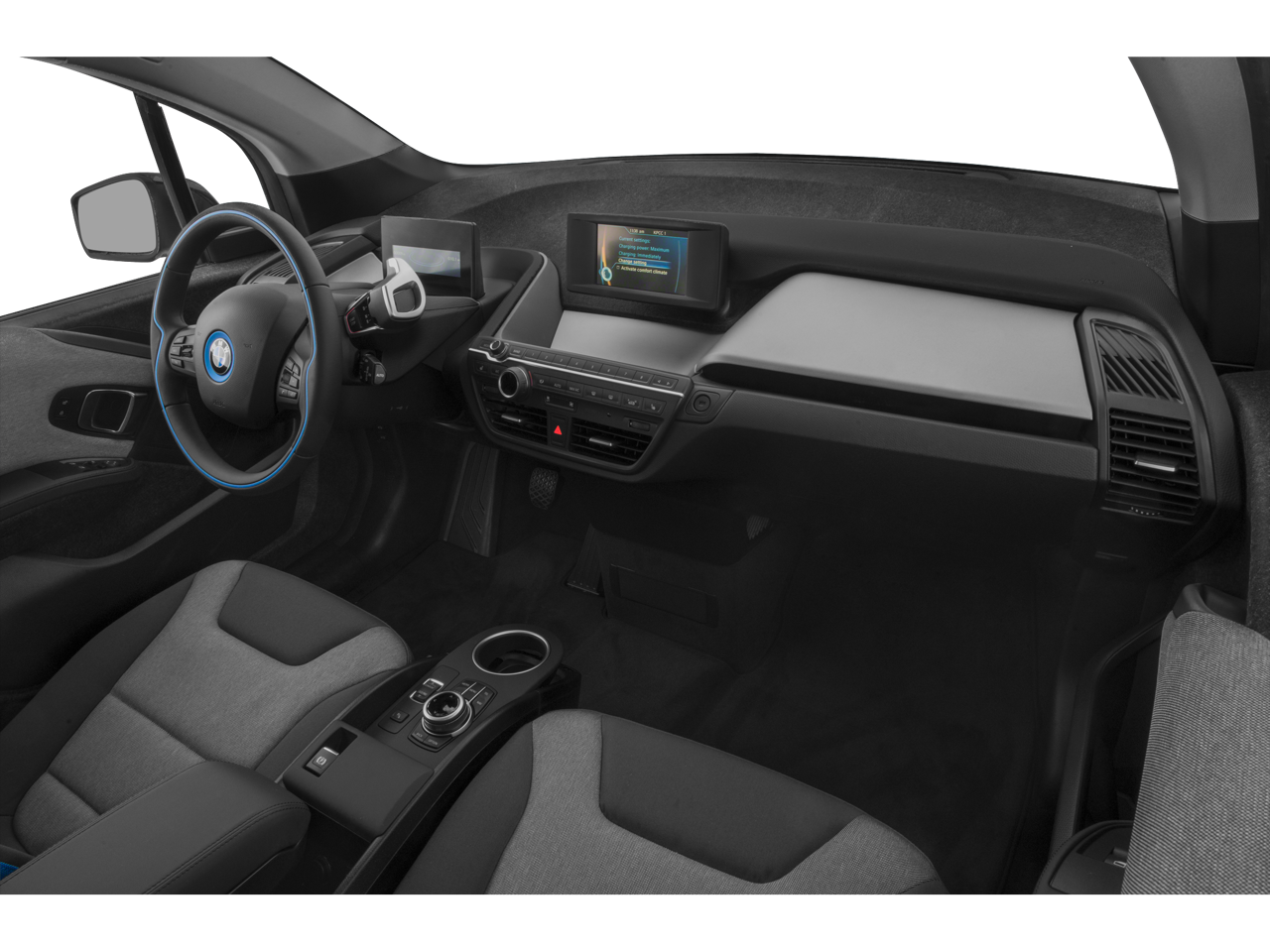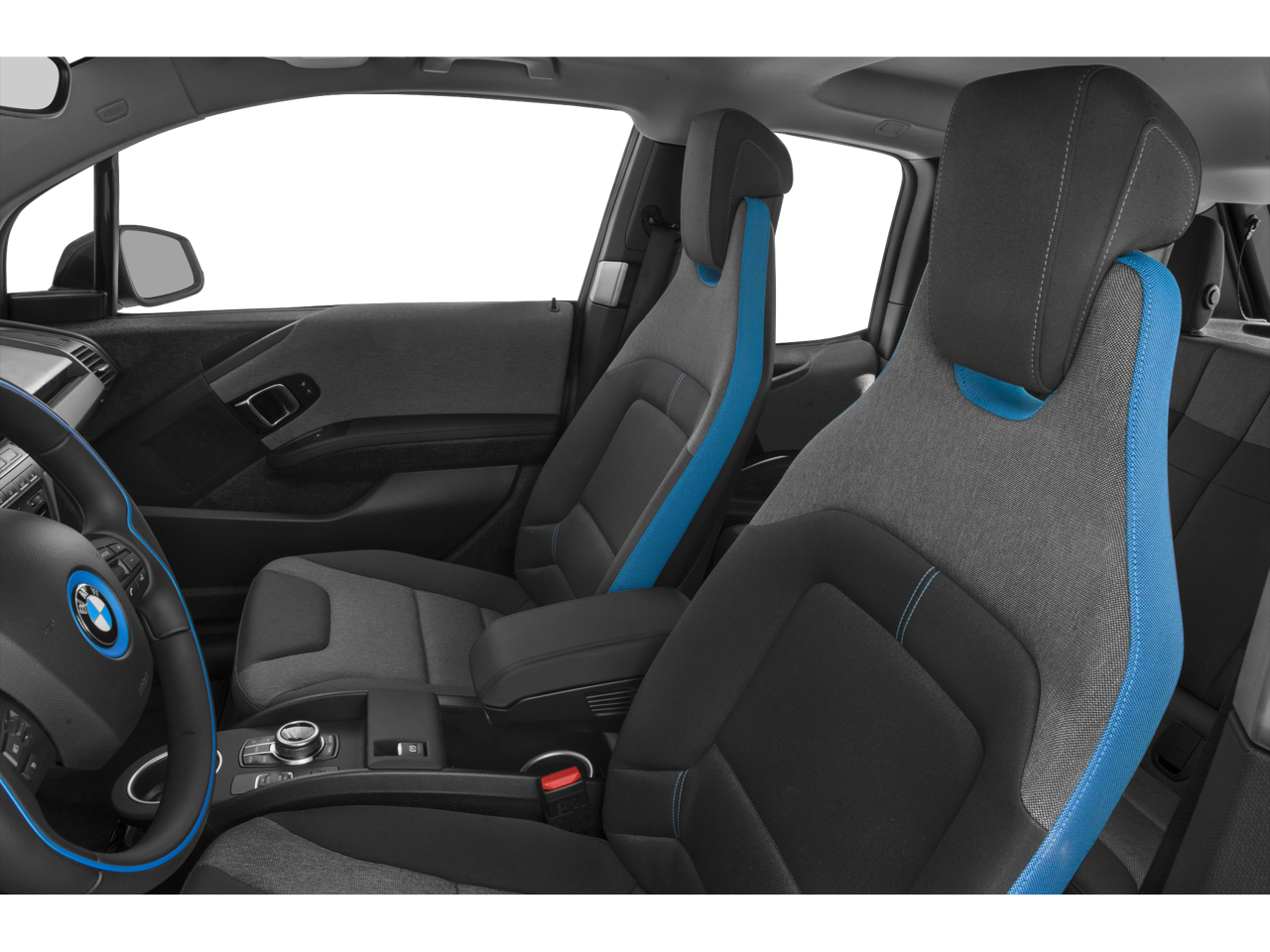 4 Speakers, 4-Wheel Disc Brakes, ABS brakes, Air Conditioning, Alloy wheels, Apple CarPlay Compatibility, Auto-dimming door mirrors, Auto-dimming Rear-View mirror, Automatic temperature control, Brake assist, Bumpers: body-color, Cloth Upholstery, Compass, ConnectedDrive Services, Delay-off headlights, Driver door bin, Driver vanity mirror, Dual front impact airbags, Dual front side impact airbags, Electronic Stability Control, Emergency communication system: BMW Assist eCall, Exterior Parking Camera Rear, Four wheel independent suspension, Front anti-roll bar, Front Bucket Seats, Front Center Armrest w/Storage, Front dual zone A/C, Front reading lights, Fully automatic headlights, HD Radio, Heat Pump, Heated door mirrors, Heated Front Seats, Heated front seats, Illuminated entry, Knee airbag, Leather steering wheel, Low tire pressure warning, Occupant sensing airbag, Outside temperature display, Overhead airbag, Panic alarm, Passenger door bin, Passenger vanity mirror, Power door mirrors, Power steering, Power windows, Radio data system, Radio: FM/HD, Rain sensing wipers, Rear window defroster, Rear window wiper, Remote keyless entry, Remote Services, Security system, SiriusXM Satellite Radio, Speed control, Speed-sensing steering, Speed-Sensitive Wipers, Split folding rear seat, Spoiler, Steering wheel mounted audio controls, Telescoping steering wheel, Tilt steering wheel, Traction control, Trip computer, Turn signal indicator mirrors, Variably intermittent wipers, and Wheels: 19 x 5.0 Front & 19 x 5.5 Rear BMW i.