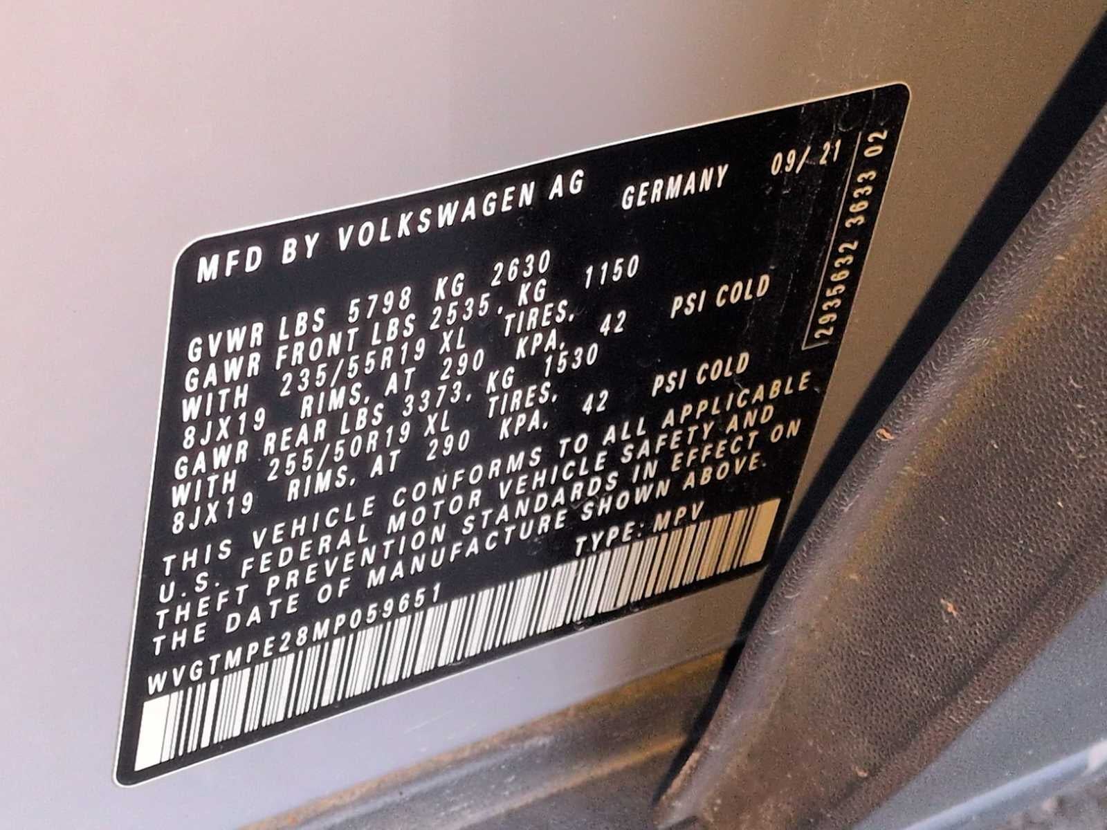 Navigation System, 4 Wheel Independent Suspension, 4.39 Axle Ratio, 7 Speakers, ABS brakes, Air Conditioning, Alloy wheels, Auto High-beam Headlights, Auto-dimming Rear-View mirror, Automatic temperature control, Brake assist, Bumpers: body-color, Delay-off headlights, Driver door bin, Driver vanity mirror, Drivers Seat Mounted Armrest, Dual front impact airbags, Dual front side impact airbags, Electronic Stability Control, Emergency communication system: VW Car-Net services (capabilities require enrollment or subscription), Exterior Parking Camera Rear, Four wheel independent suspension, Front anti-roll bar, Front Bucket Seats, Front dual zone A/C, Front fog lights, Front reading lights, Fully automatic headlights, Heated door mirrors, Heated Front Seats, Heated front seats, Heated steering wheel, Illuminated entry, Low tire pressure warning, Memory seat, Occupant sensing airbag, Outside temperature display, Overhead airbag, Overhead console, Panic alarm, Passenger door bin, Passenger seat mounted armrest, Passenger vanity mirror, Perforated V-Tex Leatherette Seating Surfaces, Power door mirrors, Power driver seat, Power Liftgate, Power passenger seat, Power steering, Power windows, Radio data system, Radio: Discover Pro Max w/12 Touchscreen Nav, Rain sensing wipers, Rear anti-roll bar, Rear reading lights, Rear seat center armrest, Rear window defroster, Rear window wiper, Remote keyless entry, Roof rack: rails only, Speed control, Speed-sensing steering, Split folding rear seat, Spoiler, Steering wheel mounted audio controls, Telescoping steering wheel, Tilt steering wheel, Traction control, Trip computer, Turn signal indicator mirrors, Variably intermittent wipers, and Wheels: 19 5-Spoke 2-Tone Machined Alloy.