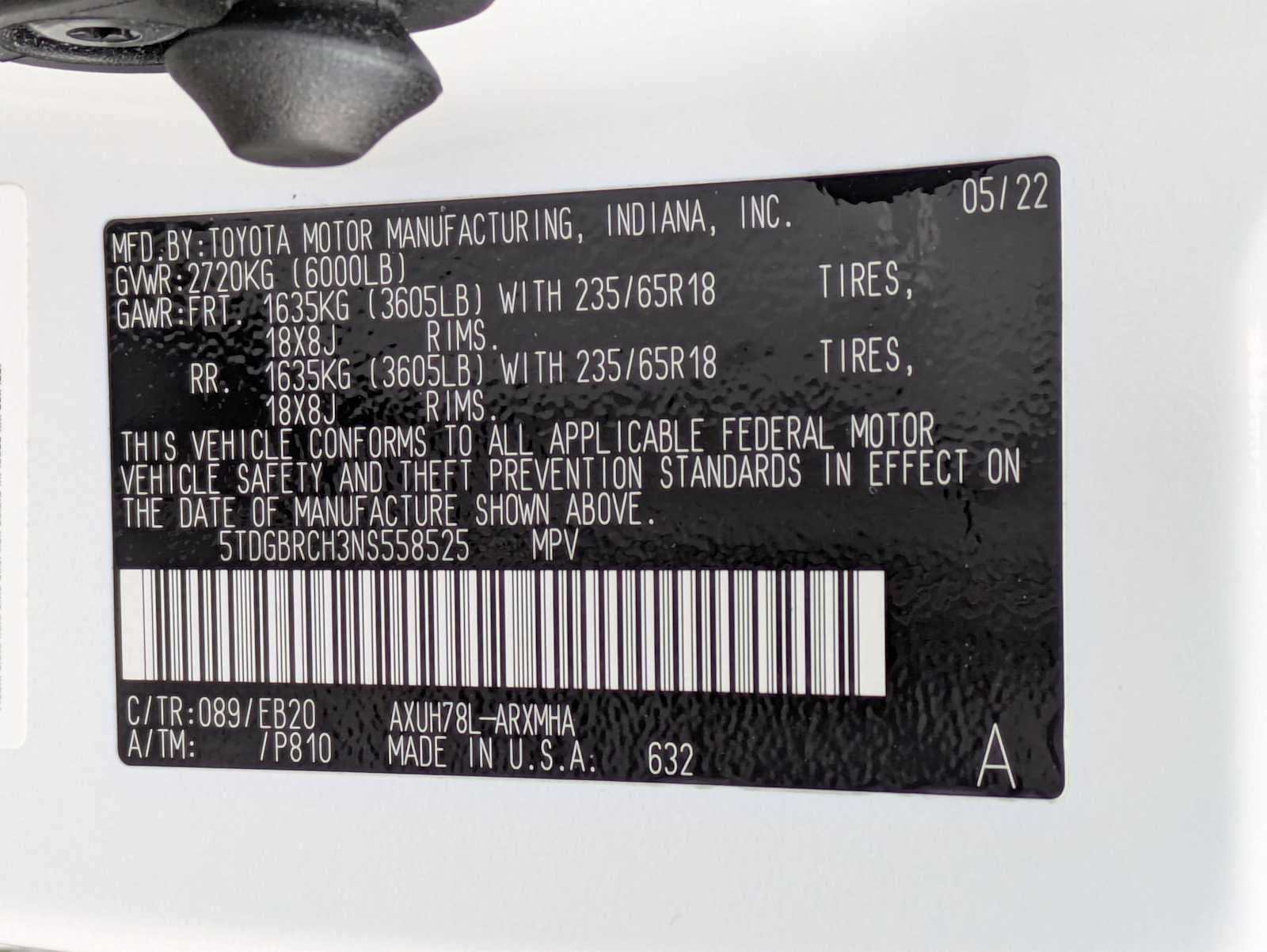ABS brakes, Active Cruise Control, Alloy wheels, Electronic Stability Control, Front dual zone A/C, Heated door mirrors, Heated Front Bucket Seats, Heated front seats, Illuminated entry, Low tire pressure warning, Navigation System, Power Liftgate, Power moonroof, Remote keyless entry, Traction control, 3rd row seats: split-bench, 4-Wheel Disc Brakes, 6 Speakers, Air Conditioning, AM/FM radio: SiriusXM, Apple CarPlay/Android Auto, Auto High-beam Headlights, Auto-dimming Rear-View mirror, Automatic temperature control, Axle Ratio TBD, Brake assist, Bumpers: body-color, Delay-off headlights, Driver door bin, Driver vanity mirror, Dual front impact airbags, Dual front side impact airbags, Emergency communication system: Safety Connect with 1-year trial, Exterior Parking Camera Rear, Four wheel independent suspension, Front anti-roll bar, Front Bucket Seats, Front Center Armrest, Front fog lights, Front reading lights, Fully automatic headlights, Garage door transmitter: HomeLink, Knee airbag, Leather Shift Knob, Occupant sensing airbag, Outside temperature display, Overhead airbag, Overhead console, Panic alarm, Passenger door bin, Passenger vanity mirror, Power door mirrors, Power driver seat, Power passenger seat, Power steering, Power windows, Radio: Audio Plus System, Rear air conditioning, Rear anti-roll bar, Rear reading lights, Rear window defroster, Rear window wiper, Reclining 3rd row seat, Roof rack: rails only, Security system, SofTex Seat Trim, Speed control, Speed-sensing steering, Split folding rear seat, Spoiler, Steering wheel mounted audio controls, Telescoping steering wheel, Tilt steering wheel, Trip computer, Turn signal indicator mirrors, Variably intermittent wipers, and Wheels: 18 Machined-Finish Alloy.