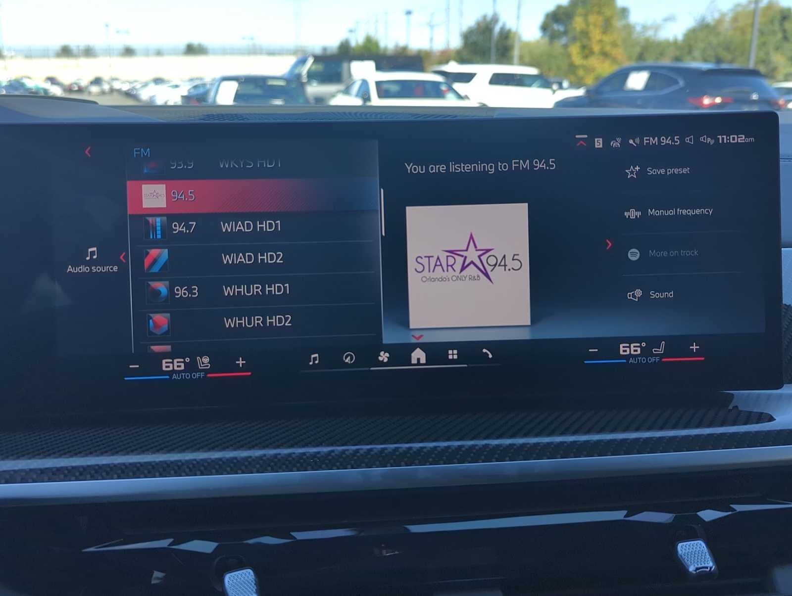 Climate Comfort Package (4-Zone Automatic Climate Control, Front & Rear Heated Seats, and Heated Front Seats, Armrests & Steering Wheel), Connected Package Pro, Parking Assistance Package (Active Park Distance Control, Parking Assistant Professional, Parking View w/3D View (Surround View), and Rear-View Camera), Apple CarPlay & Android Auto Compatibility, Exterior Parking Camera Rear, Fully automatic headlights, Heads-Up Display, Leather steering wheel, Memory seat, Navigation System, Panoramic Sky Lounge LED Roof, Power driver seat, Power Front Seats, Power passenger seat, Sensafin Upholstery, Split folding rear seat, Steering wheel mounted audio controls, Ventilated front seats, Wheels: 22 x 9.5 Fr/22 x 10.5 Rr (Style 742M), Wireless Device Charging, 16 Speakers, 4-Wheel Disc Brakes, ABS brakes, Adaptive suspension, Air Conditioning, Alloy wheels, AM/FM radio: SiriusXM with 360L, AM/FM Stereo, Apple CarPlay Compatibility, Auto High-beam Headlights, Auto tilt-away steering wheel, Auto-dimming door mirrors, Auto-dimming Rear-View mirror, Automatic temperature control, BMW Assist eCall, BMW TeleServices, Brake assist, Bumpers: body-color, Carbon Fiber Trim, Compass, ConnectedDrive Services, Delay-off headlights, Driver door bin, Driver vanity mirror, Dual front impact airbags, Dual front side impact airbags, Electronic Stability Control, Emergency communication system: BMW Assist eCall, Four wheel independent suspension, Front anti-roll bar, Front Bucket Seats, Front Center Armrest, Front dual zone A/C, Front reading lights, Front Ventilated Seats, Garage door transmitter, Genuine wood console insert, Genuine wood dashboard insert, Genuine wood door panel insert, harman/kardon Surround Sound System, harman/kardon® Speakers, Head restraints memory, Heated door mirrors, Heated Front Seats, Heated front seats, Illuminated entry, Knee airbag, Leather Shift Knob, Live Cockpit Pro, Low tire pressure warning, Multi-Contour Seats, Occupant sensing airbag, Outside temperature display, Overhead airbag, Panic alarm, Passenger door bin, Passenger vanity mirror, Personal eSIM 5G, Power adjustable front head restraints, Power door mirrors, Power steering, Power windows, Radio data system, Rain sensing wipers, Rear anti-roll bar, Rear reading lights, Rear seat center armrest, Rear window defroster, Rear window wiper, Remote keyless entry, Security system, SiriusXM Satellite Radio, Speed control, Speed-sensing steering, Speed-Sensitive Wipers, Spoiler, Sport steering wheel, Steering wheel memory, Tachometer, Telescoping steering wheel, Tilt steering wheel, Traction control, Trip computer, Turn signal indicator mirrors, and Variably intermittent wipers.